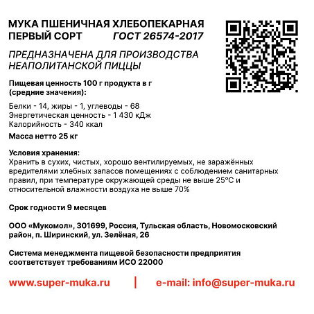 Полностью соответствует итальянским стандартам качества. Обладая идентичными реологическими характеристиками, не уступает по качеству известным итальянским брендам муки. Производится из специально подобранного высококачественного зерна пшеницы по особой технологии размола, что позволяет добиться идеального качества неаполитанской пиццы - тонкой основы, прекрасно удерживающей начинку, воздушного, ярко выраженного бортика с характерным «леопардовым» орнаментом.