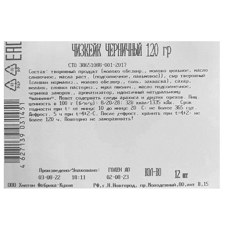 Творожный продукт (молоко обезжир., молоко цельное, масло сливочное, масла раст. (подсолнечное, пальмовое)), сыр творожный (сливки нормализ., молоко обезжир., соль, закваска), сахар, меланж, сливки пастериз., мука пшенич., масло подсолнечное, черника заморож., ароматизатор, идентичный натуральному «ванилин». Может содержать следы арахиса и других орехов.