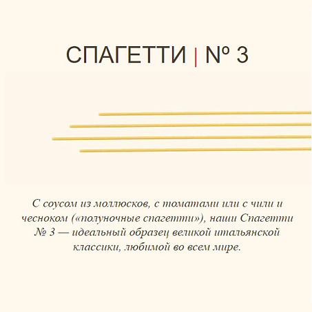 Паста Rummo производится по уникальной технологии Lenta Lavorazione, основанный на старинном традиционном способе. Только из твёрдой пшеницы, на чистой родниковой воде и без консервантов. Спаггетти являются классической основой многочисленных итальянских блюд и широко используются на кухне. Прекрасным дополнением к пасте может стать всего лишь оливковое масло и томатный соус. Время варки 9 минут