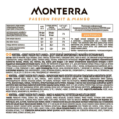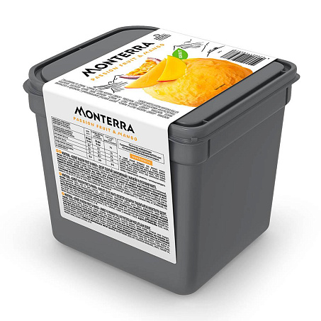 Пюре из маракуйи, вода питьевая, сахар, глюкоза, кусочки манго, глюкозный сироп, пюре из манго, сок лимонный концентрированный, Стабилизаторы: камедь рожкового дерева, гуаровая камедь, пектины; ароматизатор натуральный.