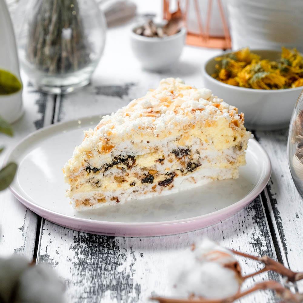 Нежный, хрустящий десерт, а чернослив и орехи придают ему изысканности.