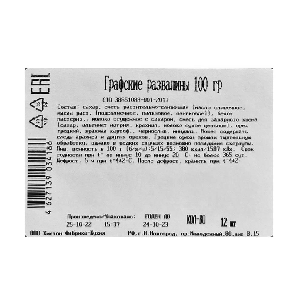 Сахар, смесь растительно-сливочная (масло сливочное, масла раст. (подсолнечное, пальмовое, оливковое)), белок пастериз., молоко сгущенное с сахаром, смесь для заварного крема (сахар, альгинат натрия. крахмал, молоко сухое цельное), орех грецкий, крахмал картоф., чернослив, миндаль. Может содержать следы арахиса и других орехов. Грецкие орехи прошли тщательную обработку, однако в редких случаях возможно попадание скорлупы.