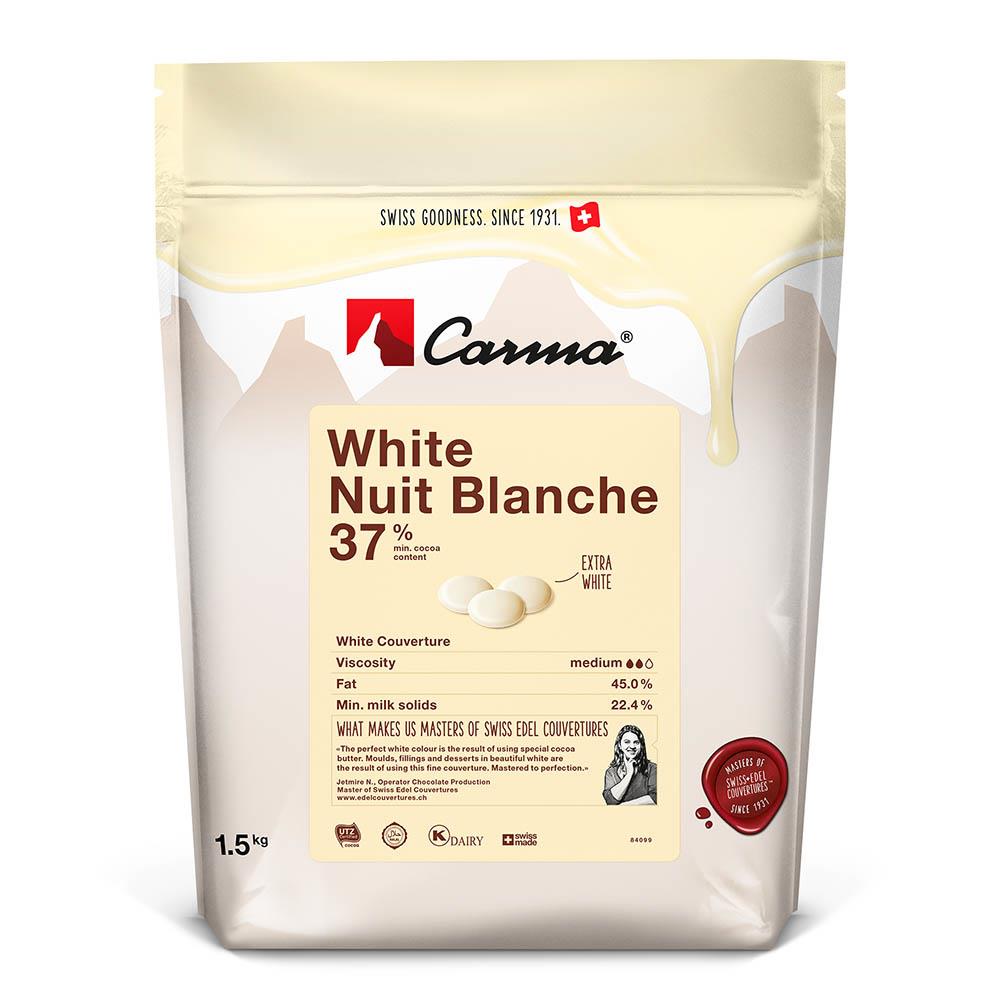 Белый шоколад White Nuit Blanche. 37% какао, 22,3% молоко, 45% жиры. Белый кувертюр, сочетает в себе швейцарское молоко и сливки со специально отобранным какао-маслом. Вкус шоколада имеет изысканную сливочную сладость, низкое содержание сахара и устойчивые ноты ванили.
