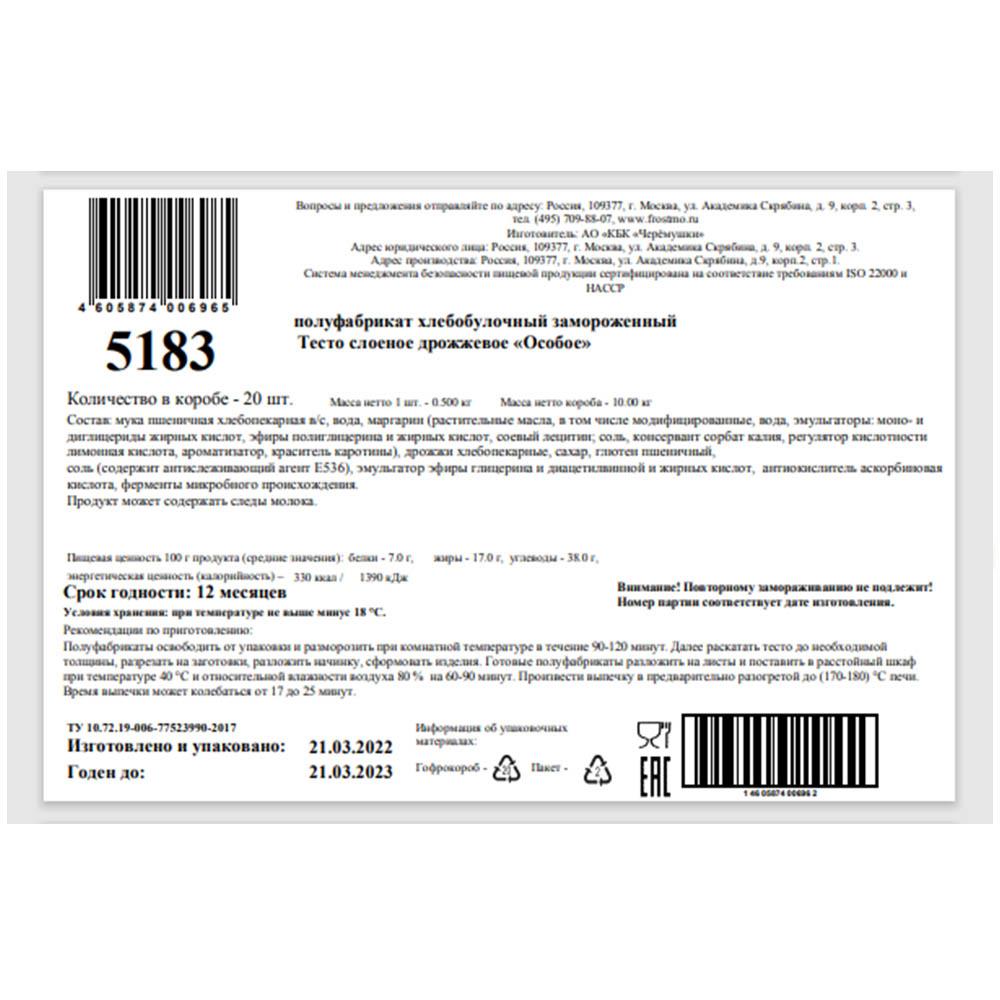 Тесто слоеное дрожжевое Особое 20х500гр/кор Черемушки Россия (5183) (КОР) (КОД 57306) (-18°С)
