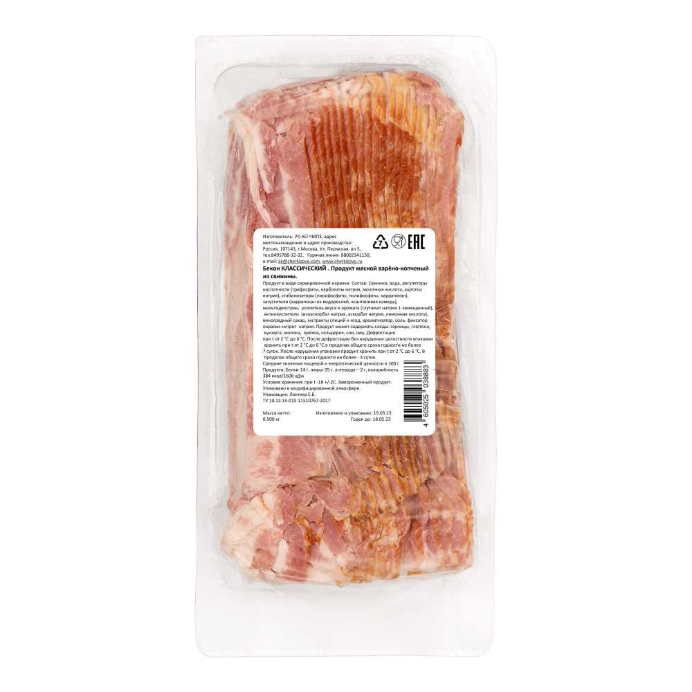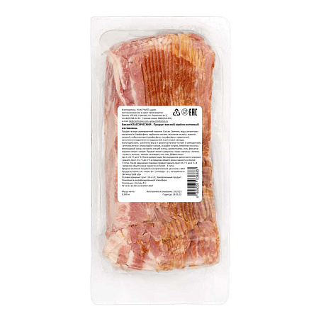 Грудореберная часть (грудинка) без шкуры, без кости, нарезанная на слайсы с ровным срезом. Слайсы уложены в упаковку с нахлестом друг на друга.Упаковано в модифицированной атмосфере в прозрачный лоток, размером 240х120х45 мм. На лицевой стороне лотка нанесен термочек с технической информацией.Не допускается: