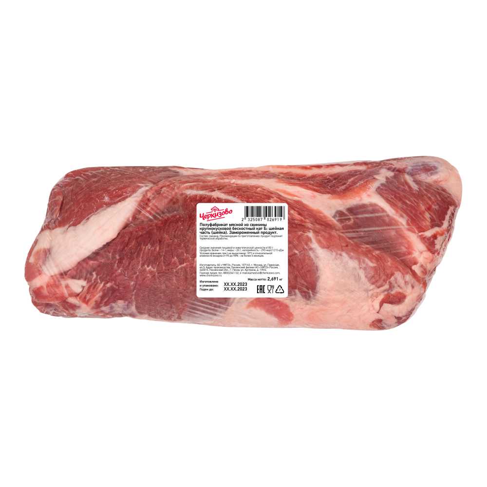 Детальное описание: Полуфабрикат мясной из свинины крупнокусковой бескостный категории Б: шейная часть (шейка).