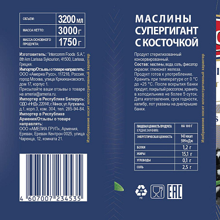 Маслины Супер-гигант 60/80 с/к 3кг/3,1л (осн.пр.1,75кг) ж/б Federici™ Греция (КОД 57844) (+18°С)