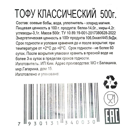 Творог соевый Тофу классический 500гр в/у TOFU House™ ТУ ИП Ким Россия (КОД 58279) (0°С)