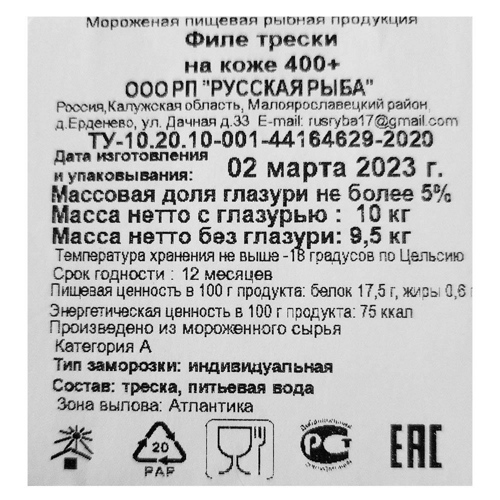Треска атлантическая филе на коже 400гр+ 10кг/кор IQF 5%гл кат А Русская Рыба РП (КОР) (КОД 59004) (-18°С)