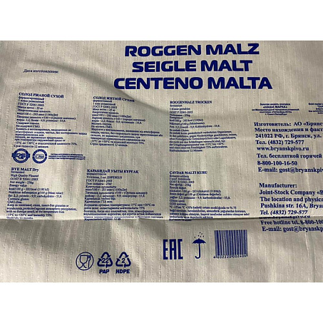 Солод ржаной сухой 25кг/мешок ГОСТ Брянскпиво Россия (КОД 58991) (+18°С)