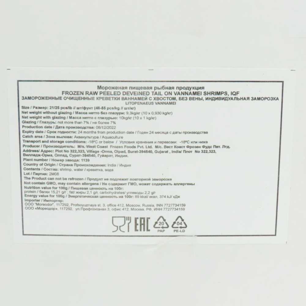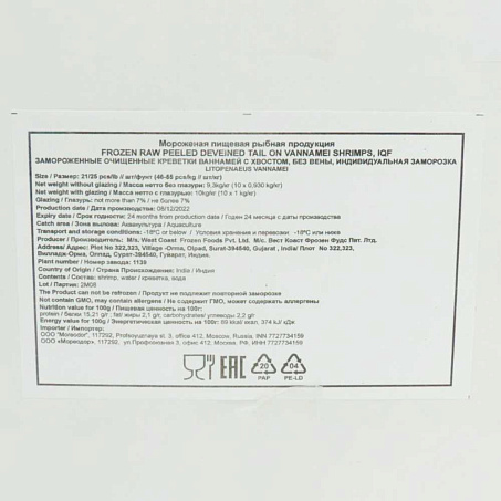 Креветки Ваннамей Королевские очищ с/хв б/пищ 21/25 (lb) 935гр/пакет IQF +7%гл Индия (ПУ) (КОД 59103) (-18°C)