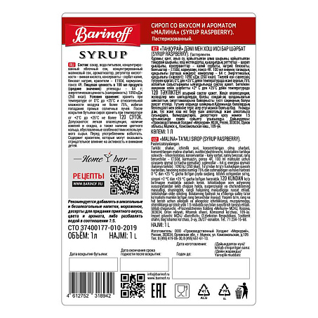 Сироп Малина 1л ст/б Barinoff Syrup™ Россия (КОД 59721) (+18°С)