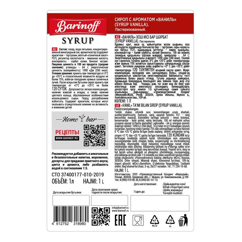 Сироп Ваниль 1л ст/б Barinoff Syrup™ Россия (КОД 59728) (+18°С)