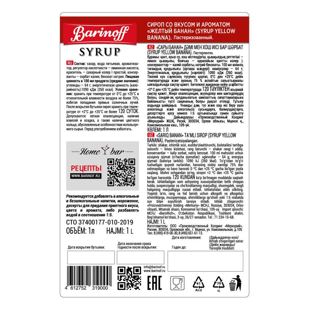 Сироп Желтый банан 1л ст/б Barinoff Syrup™ Россия (КОД 59729) (+18°С)