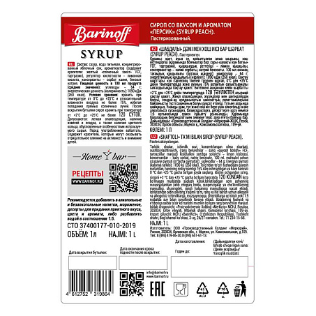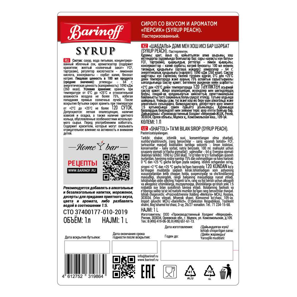 Сироп Персик 1л ст/б Barinoff Syrup™ Россия (КОД 59768) (+18°С)