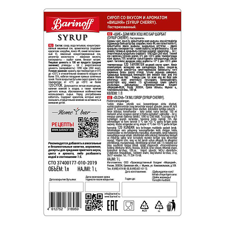 Сироп Вишня 1л ст/б Barinoff Syrup™ Россия (КОД 59782) (+18°С)