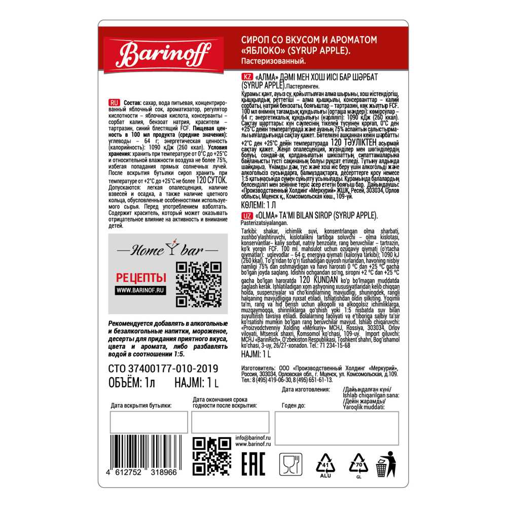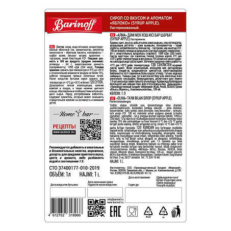 Сироп Яблоко 1л ст/б Barinoff Syrup™ Россия (КОД 59783) (+18°С)
