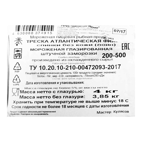 Треска атлантическая филе спинки лойн б/кожи 200-500гр 4кг/кор IQF 5%гл Капитан Немо (КОР) (КОД 60135) (-18°С)