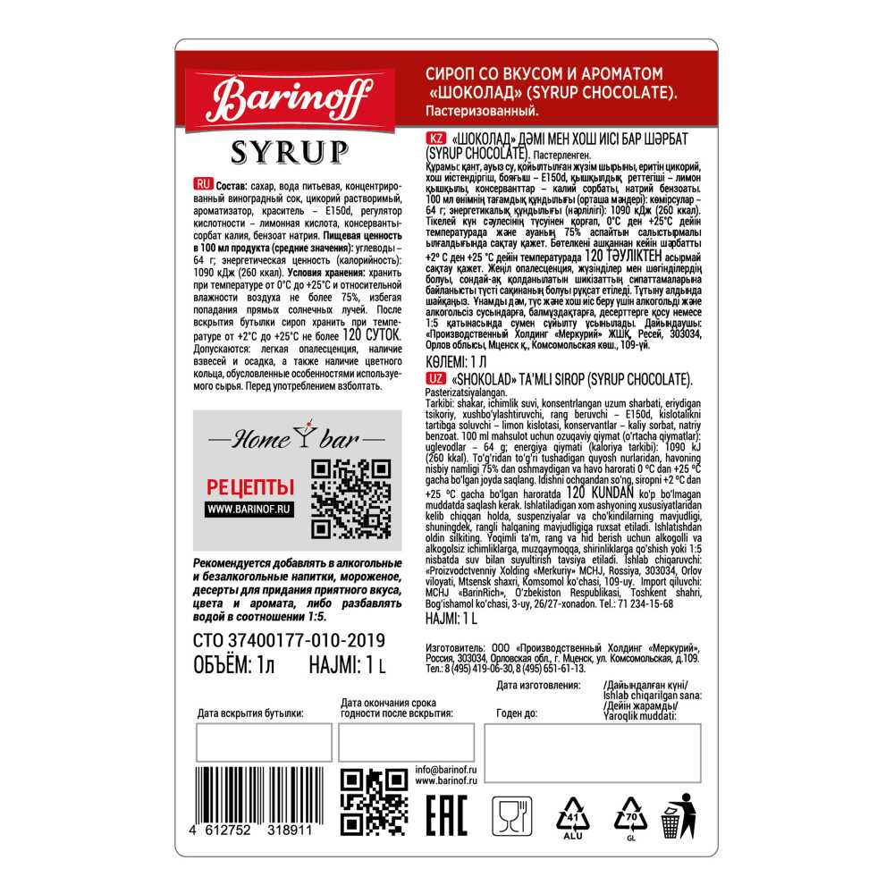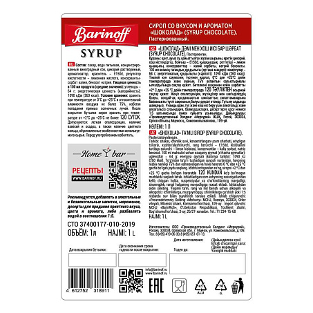 Сироп Шоколад 1л ст/б Barinoff Syrup™ Россия (КОД 60275) (+18°С)