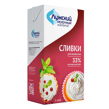 Сливки 33% 1л tetra-pak крем для взбивания без крышки БЗМЖ UHT Лужский МК(NEW) (КОД 60914) (0°С)