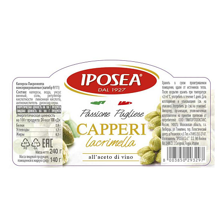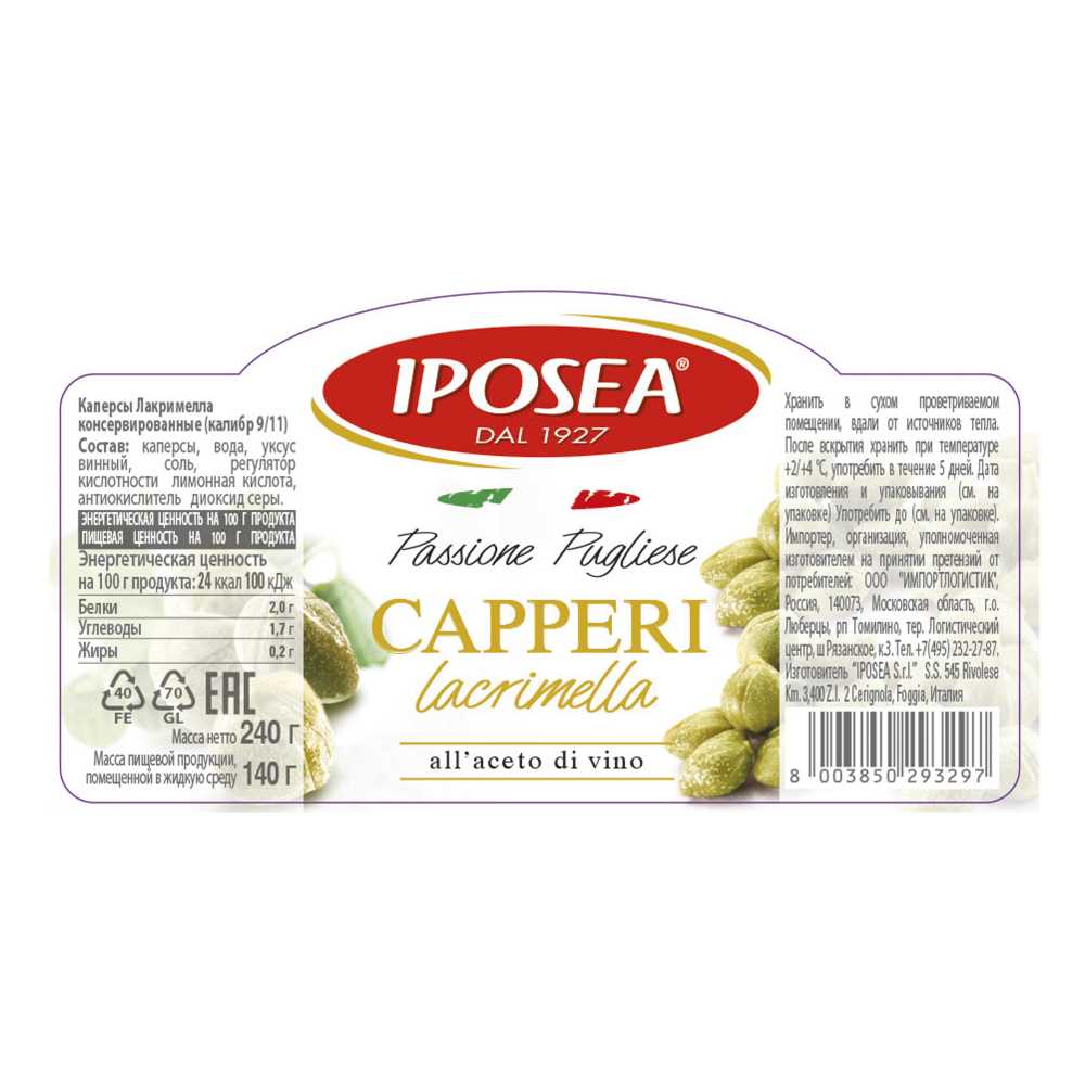 Детальное описание: Капперсы Лакримелла в уксусе "И.П.О.С.Е.А."великолепны для приготовления холодных и горячих закусок, рыбных и мясных салатов, заправки соусов и  супов.