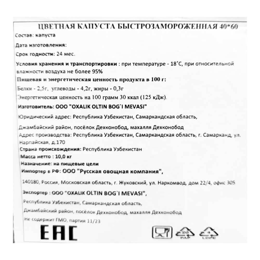 Капуста цветная с/м 10кг/кор Узбекистан (ПУ) (КОР) (КОД 61953) (-18°С)