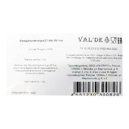 Миндальная мука, изготовлена из 100 % ядра бланшированного миндаля, дробленые, подсушенные Для изготовления используются крупные ядра орехов, которые в процессе производства измельчаются в пудру, размер помола 0,8-1,00 мм. При изготовлении муки используются технологии, которые помогают сохранить все полезные свойства ореха. Применяется в первую очередь для приготовления различных десертов.