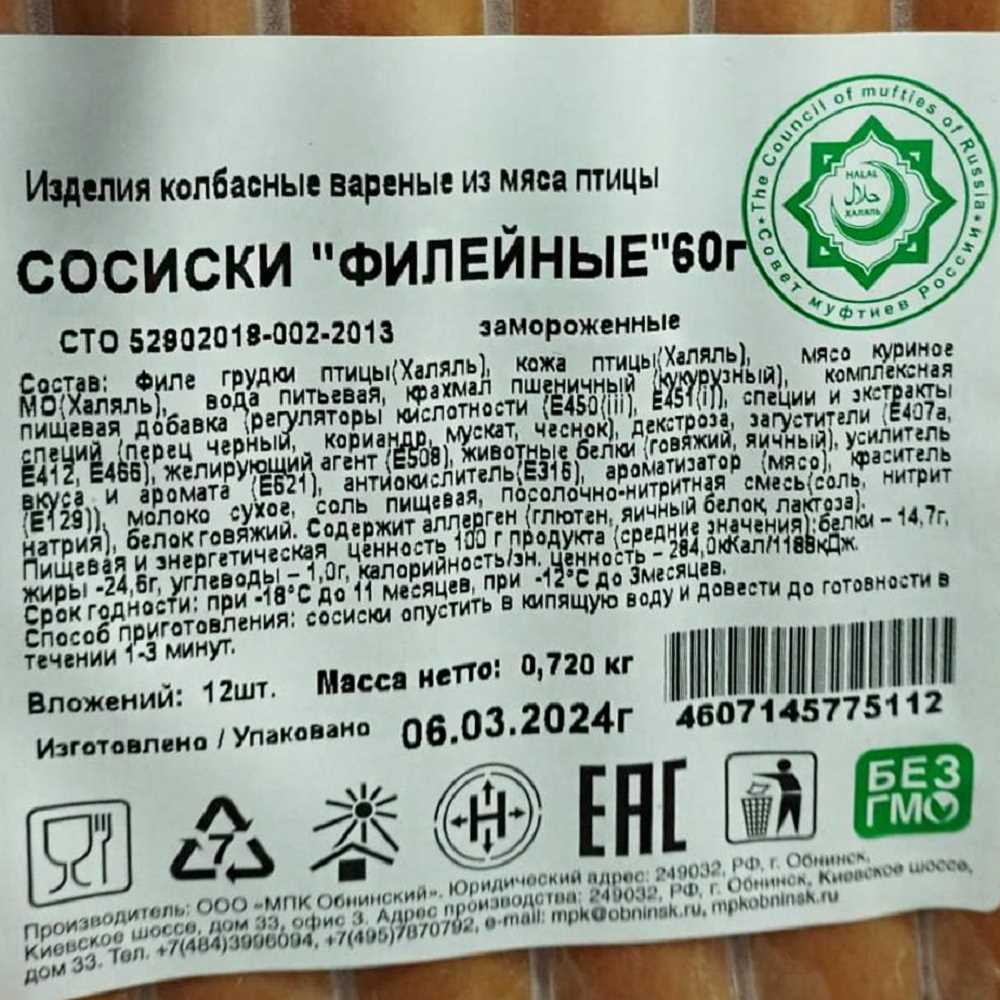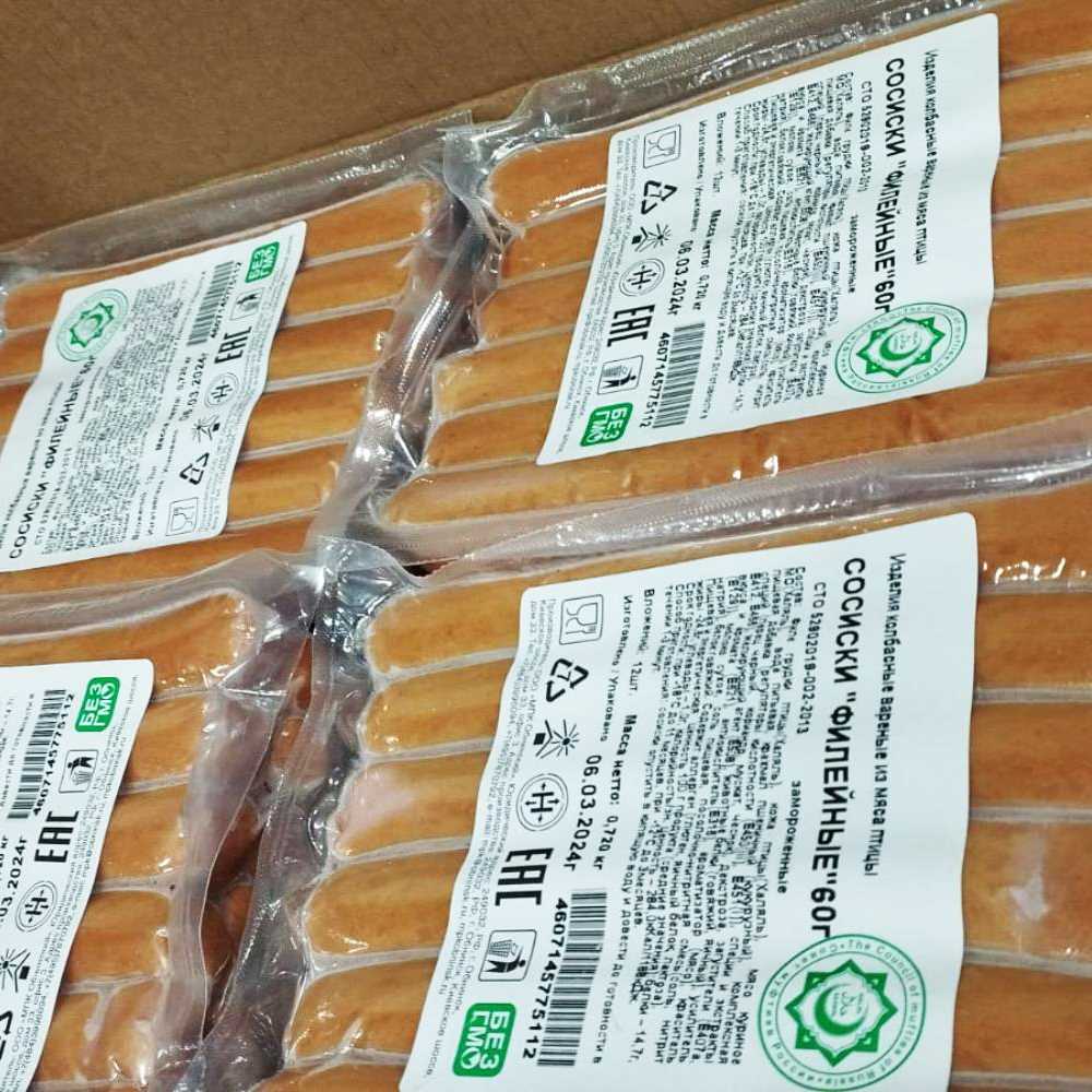 Сосиски Филейные из птицы зам б/оболоч 60гр 17см Ø22мм 720гр в/у Халяль Рамай Обнинский МПК (КОД 63458)(-18°С)