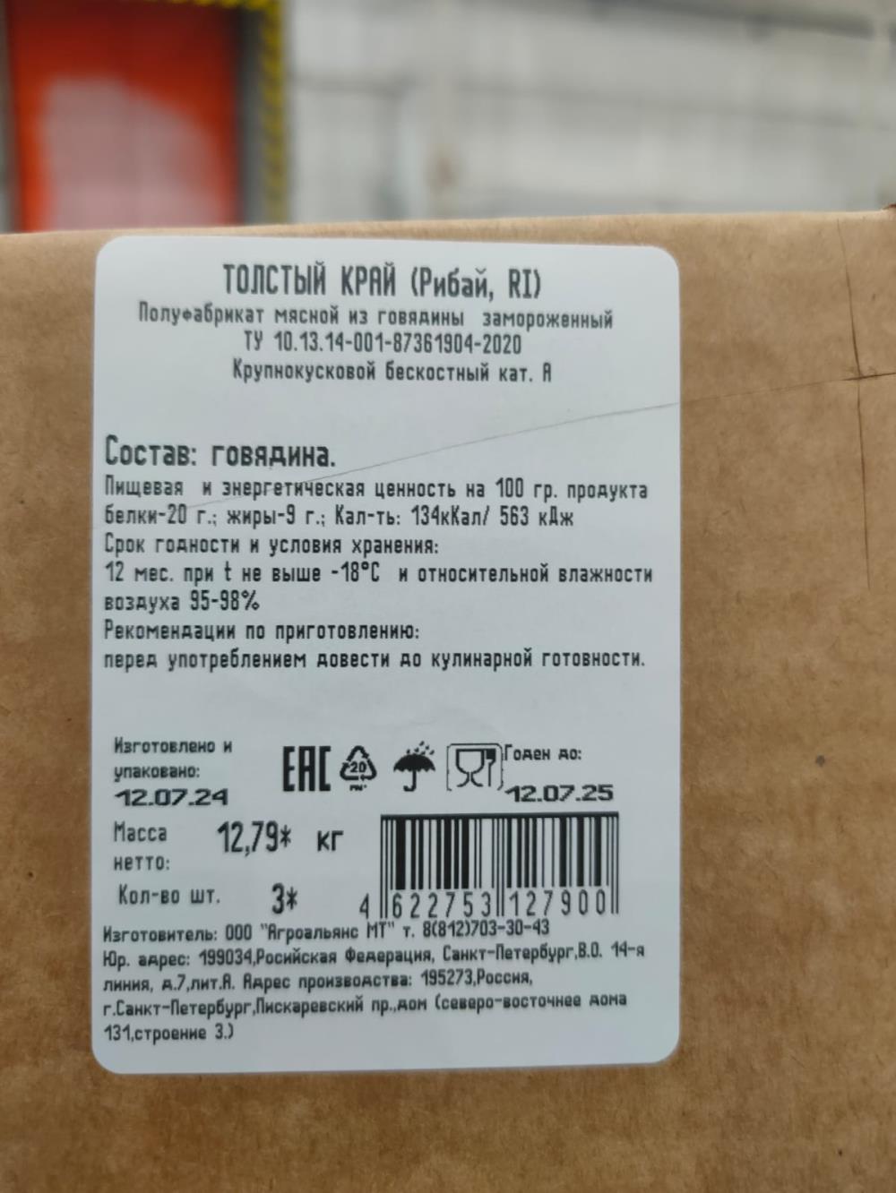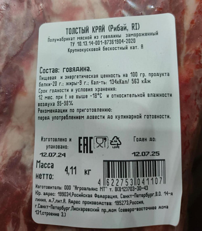 Говядина Рибай толстый край б/к ~4-5кг Премиум кат.А мраморная Агроальянс МТ Россия (КОД 70192) (-18°С)