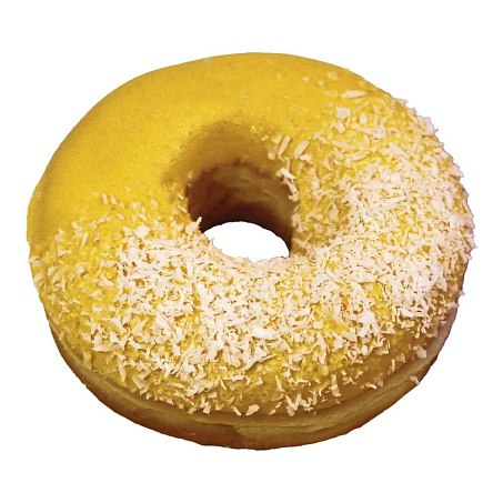 пшеничная мука высшего сорта, вода, соль, сахар, меланж, масла растительные рафинированные дезодорированные, подсолнечное, кокосовое, вода, регулятор кислотности (лимонная кислота), сироп глюкозный кукурузный, глицерин, дрожжи, начинка кондитерская со вкусом манго (сахар, вода питьевая, патока, загуститель Е1442, эмульгатор целлюлозы, регуляторы кислотности лимонная кислота и цитрат натрия 3-замещённый, ароматизатор "Манго", консервант сорбат калия), глазурь кондитерская белая (сахар, заменитель масла какао нетемперируемый лауринового типа (масло пальмоядровое рафинированное, дезодорированное, гидрогенезированное, эмульгаторы (Е492, Е322)), носитель карбонат кальция , ароматизаторы "Ванилин", "Сливки", регулятор кислотности кислота лимонная, эмульгаторы (Е322, Е476), посыпка кондитерская кокосовая стружка натуральная. Краситель Е102, Е133. Содержит молочные продукты, может содержать следы орехов.