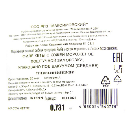 Кета филе на коже с/м 700+ в/у кат А РПЗ Максимовский Россия (КОД 70999) (-18°С)
