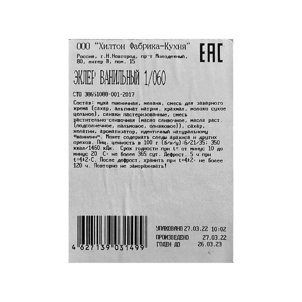 Эклер ванильный 60гр х6шт/уп х2/кор Бенье Хилтон Фабрика-кухня Россия (66) (КОР) (КОД 72672) (-18°С)