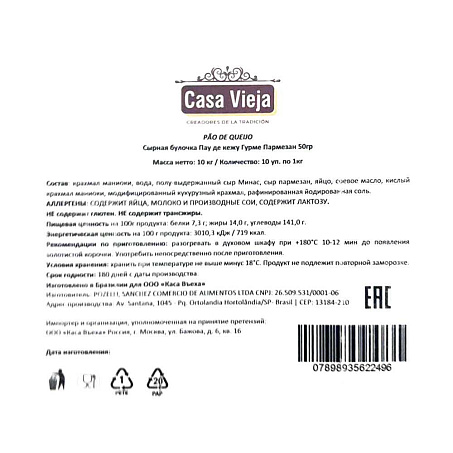 крахмал маниоки, вода, полу-выдержанный сыр Минас, сыр пармезан, яйцо, соевое масло, кислый крахмал маниоки, модифицированный кукурузный крахмал, рафинированная йодированная соль.