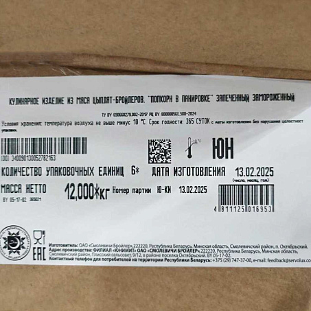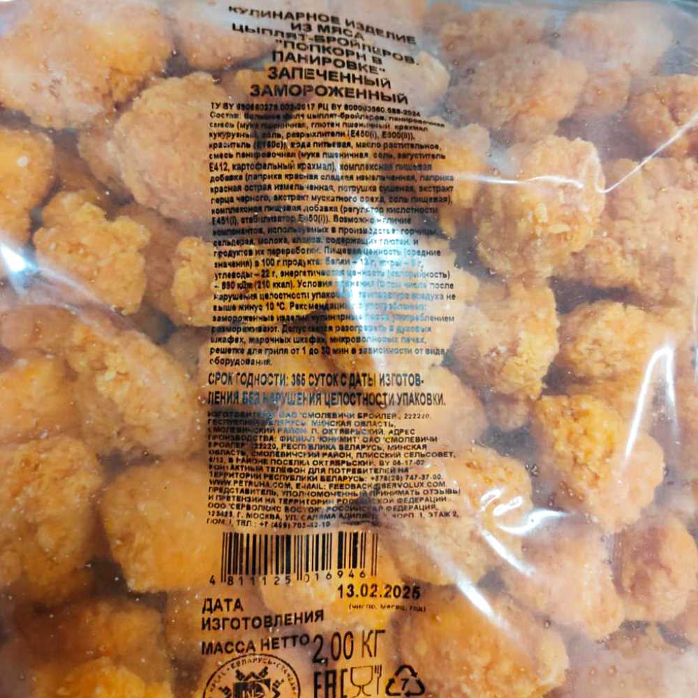 Куриный Попкорн готовые кусочки в панировке 2кг калибр Халяль Смолевичи Бройлер Беларусь (КОД 72829) (-18°С)