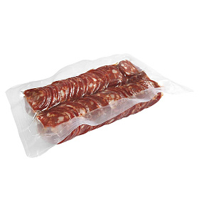 мясо птицы курица, свинина, шпик, белковый стабилизатор (шкура свиная, вода), растительный жир, стабилизатор E401, сыворотка сухая молочная, лактоза, стабилизаторы (Е450, E452, E333), загустители (Е417, E415), молоко сухое обезжиренное, смесь посолочно-нитритная (соль пищевая, фиксатор окраски нитрит натрия), стабилизатор (Е1412), глюкоза, усилитель вкуса и аромата (глутамат натрия), антиокислители (аскорбиновая кислота, аскорбат натрия), перец черный,чеснок, экстракты специй (муската, чили, можжевельника, кориандра), ароматизатор, идентичный натуральному Ваниль, гемоглобин сухой, краситель (кармины).