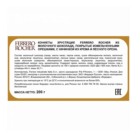 Конфеты шоколадные Ferrero Rocher 200гр пл/конт Ферреро Руссия Россия (КОД 38998) (+18°С)