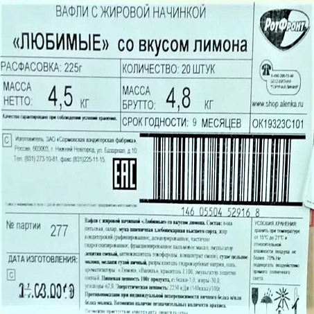 Хрустящие нежные вафли «Любимые» от фабрики «Рот Фронт» с нежным ароматом лимона и легкими ванильными нотками. Хороши и в качестве домашней сладости, и как офисный сладкий перекус. Сахарный крем освежает лимонной свежестью и тает во рту вместе с тонкими воздушными вафельными пластинками. Прекрасное дополнение к черному чаю и кофейным напиткам.
