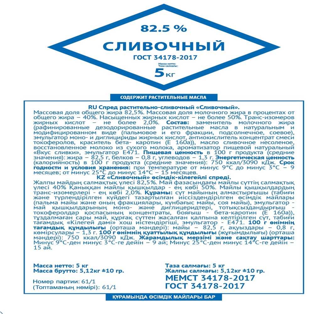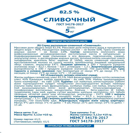 Спред 82,5% растит-сливочный 5кг/кор СЗМЖ ГОСТ Экомилк Россия (КОР) (КОД 39393) (-18°С)
