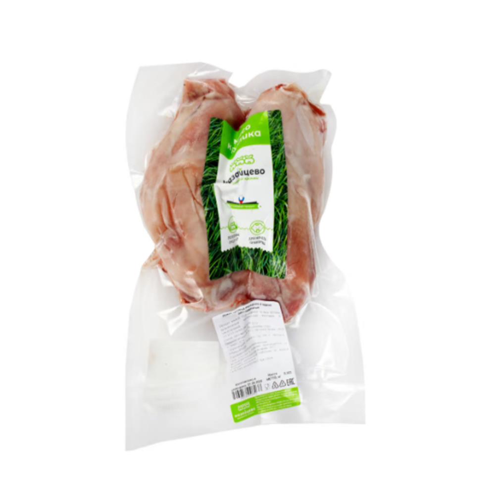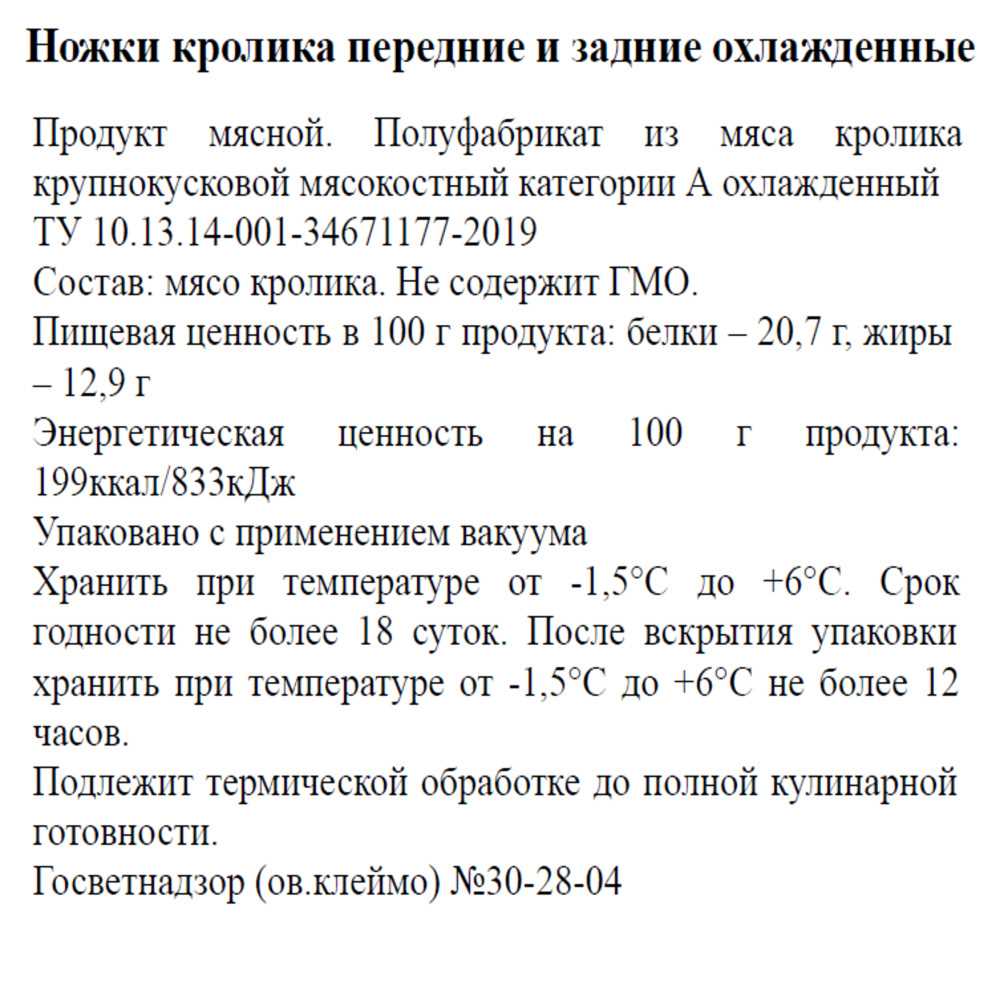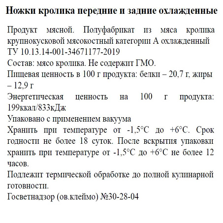 В каждой упаковке расположены: две передние ножки кролика - лопатки (средний вес каждой лопатки ~125 гр) и две задних ножки кролика - окорочка (средний вес каждого окорока ~250 гр)
