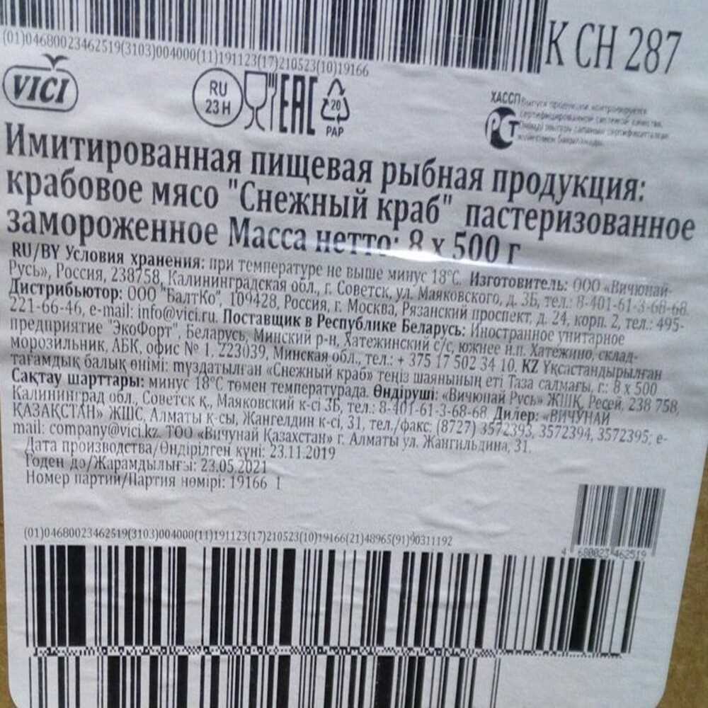 Крабовое мясо 500гр (имитация) Снежный краб неокраш Vici™ Вичюнай-Русь Россия (КОД 40031) (-18°С)